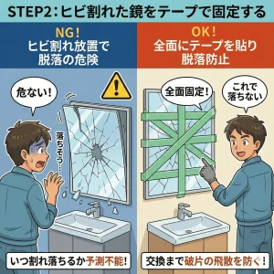 まだ枠に残っている鏡も、いつ崩れ落ちるかわかりません。交換するまでの間、養生テープやガムテープを全面に貼り、破片が脱落しないように固定してください。