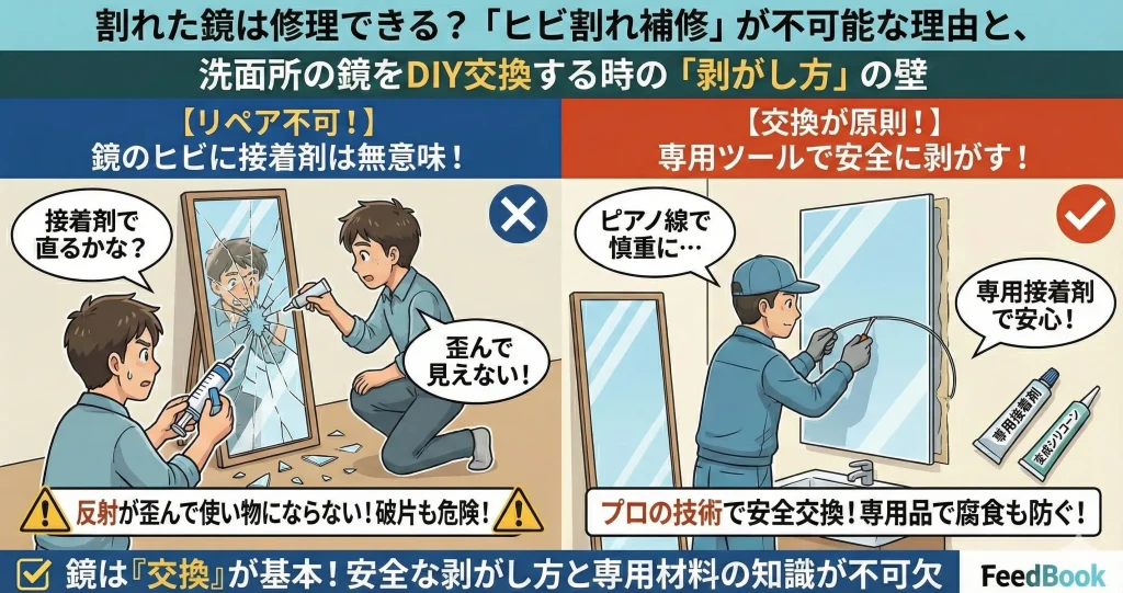 - 鏡のヒビは直せない!「接着剤補修」が無意味な理由 洗面所の鏡を剥がすのは危険!プロが使う「ピアノ線」の技術 普通のコーキングはNG!鏡を黒く腐食させない「専用接着剤」の選び方 ネットオーダーで格安交換!採寸のコツと取り付け手順