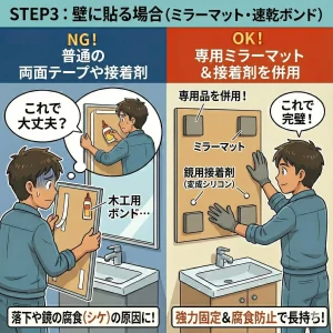 新規で壁に貼る場合、スポンジ状の両面テープ「ミラーマット」と、鏡用接着剤(速乾ボンドや変成シリコン)を併用します。マットで仮固定し、ボンドで完全固定する仕組みです。