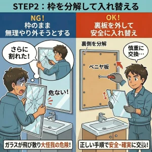 鏡を剥がしたら、裏の石膏ボードやベニヤが湿気で腐っていた場合、そのまま新しい鏡を貼っても落下します。壁の補修工事(大工工事)が必要です。