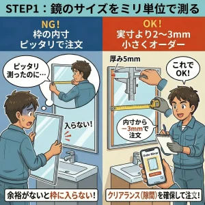 割れた鏡の縦・横・厚み(通常3mmか5mm)を測ります。「オーダーミラー専門店」のサイトに入力すると、指定サイズにカットされた鏡が届きます。