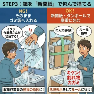 割れた鏡をそのままゴミ袋に入れると、収集作業員の方が怪我をします。必ず新聞紙やダンボールで何重にも包み、袋の外側に「キケン!割れ物」「カガミ」と大きく書いて、自治体の指示(不燃ゴミ等)に従って出してください。