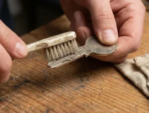 鍵の溝に細かいゴミや糸くずが詰まっているだけでも、シリンダー内部のピンが噛み合わず、回りにくくなる原因になります。使い古しの歯ブラシで溝を丁寧にブラッシングし、浮き出た汚れを乾いた布で拭き取ってください。