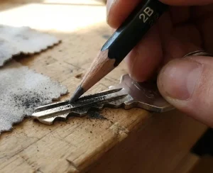 鉛筆の芯に含まれる黒鉛は、金属同士の滑りを良くする潤滑材として働きます。鍵の切り込み部分を鉛筆でやや強めになぞって黒く塗り、そのまま鍵穴に差し込んで何度か抜き差しを行ってください。