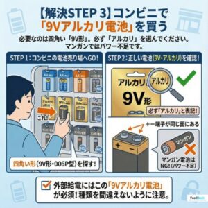 一般的な単3電池ではなく、四角い形の「9V形(006P型)」電池が必要です。必ず「アルカリ」を選んでください。マンガン電池ではパワー不足で起動しないことがあります。