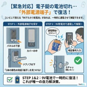 ドアノブやパネルの下、またはカバーの中に、2本の銀色の突起(端子)がありませんか? ここにコンビニで売っている「9V角形アルカリ乾電池」の電極を強く押し当ててください。一時的に通電し、その状態で暗証番号やカードを使えば開錠できます。