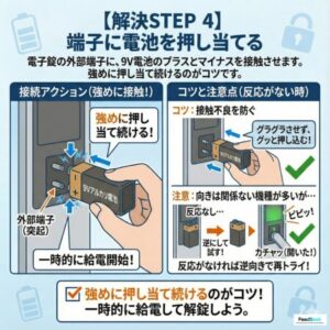 電子錠の外部端子(2本の突起)に、電池のプラスとマイナスを接触させます。向きは関係ない機種が多いですが、反応がない場合は逆にして試してください。