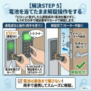 「ピロッ」と音がして画面が点いたら通電成功です。電池を離さずに、もう片方の手で暗証番号を入力するか、カードキーをかざしてください。モーターが動いて鍵が開きます。