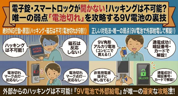電子錠・スマートロックが開かない!ハッキングは不可能?唯一の弱点「電池切れ」を攻略する9V電池の裏技