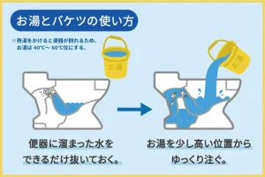 便器内の水をバケツで汲み出して少なくし、40〜50度程度のお湯を高い位置から注ぎます(※熱湯は陶器が割れる恐れがあるため使用しないでください)。そのまま20〜30分放置してペーパーを十分にふやかしてから、ゆっくりと水を流します。