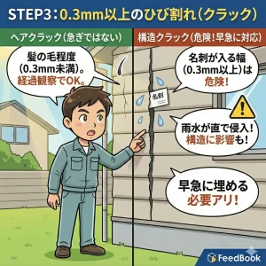 髪の毛程度の細いヒビ(ヘアクラック)なら急ぎませんが、名刺が入る幅(0.3mm以上)のヒビは「構造クラック」の可能性があります。雨水が直で入るため、早急に埋める必要があります。