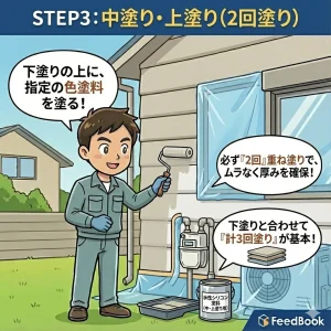 指定の塗料(水性シリコンなどがDIY向き)を塗ります。ムラをなくし、塗膜の厚みを確保するために、必ず「2回」重ね塗りをします。下塗りと合わせて「計3回塗り」が基本です。