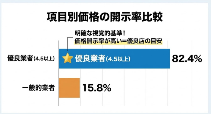 その結果、優良業者の82.4%が「基本料金・作業費・材料費」を個別に細分化して記載しているのに対し、一般的業者で同様の開示を行っているのはわずか15.8%に留まりました。