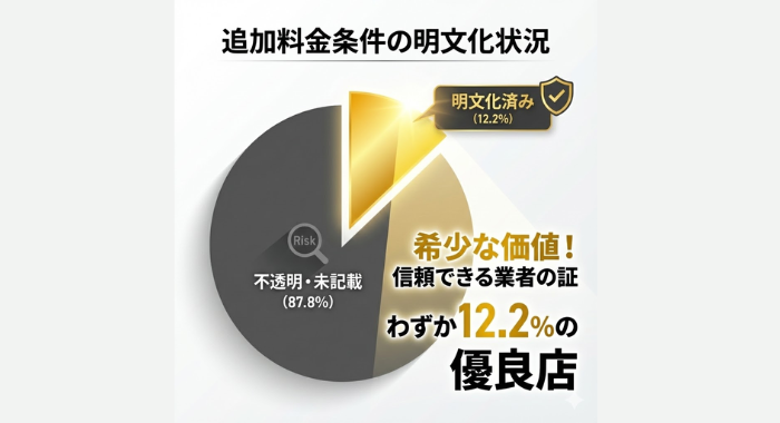 消費者が業者選びで失敗する最大の要因は、駐車場代やキャンセル料、深夜割増といった「付帯費用」の不透明さです。全18,342社のうち、これらの追加料金発生条件をすべて詳細に明文化している業者は全体の12.2%しか存在しませんでした。